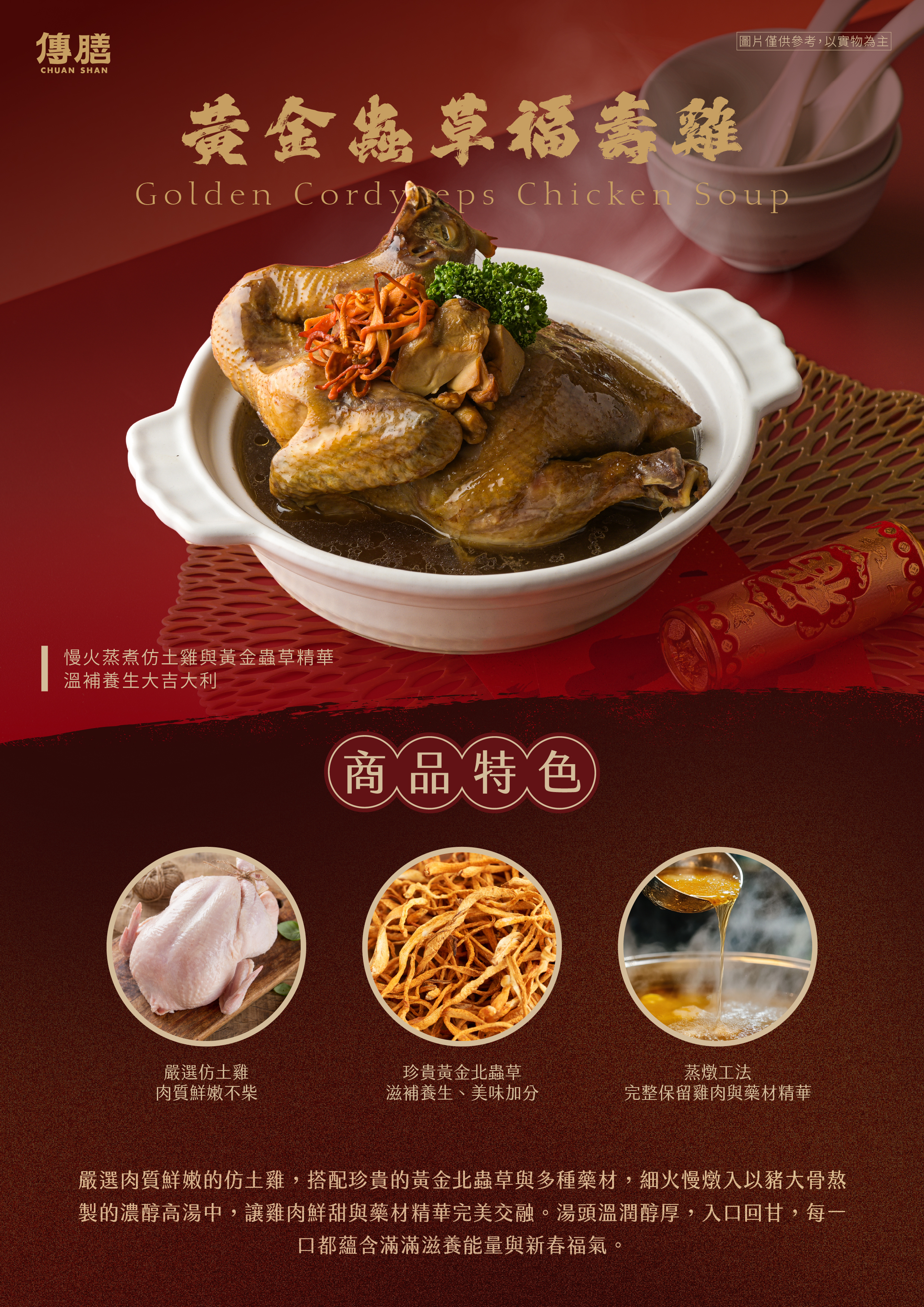 慢火蒸煮仿土雞與黃金蟲草精華,溫補養生大吉大利